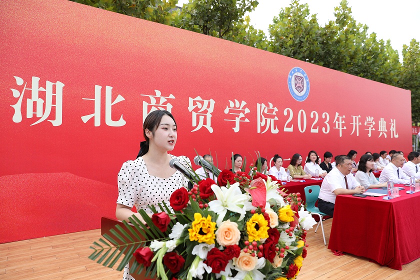 “正大杯第十三届全国大学生市场调查与分析大赛省赛一等奖”获得者、管理学院2021级电子商务专业刘晶同学作为老生代表发言,她与新生们分享了自己在湖商的成长经历,讲述了校园面貌与教学条件的巨大变化。希望大家珍惜学校提供的广阔平台,扎根其中,汲取丰富的营养,斩获耀眼的佳绩。